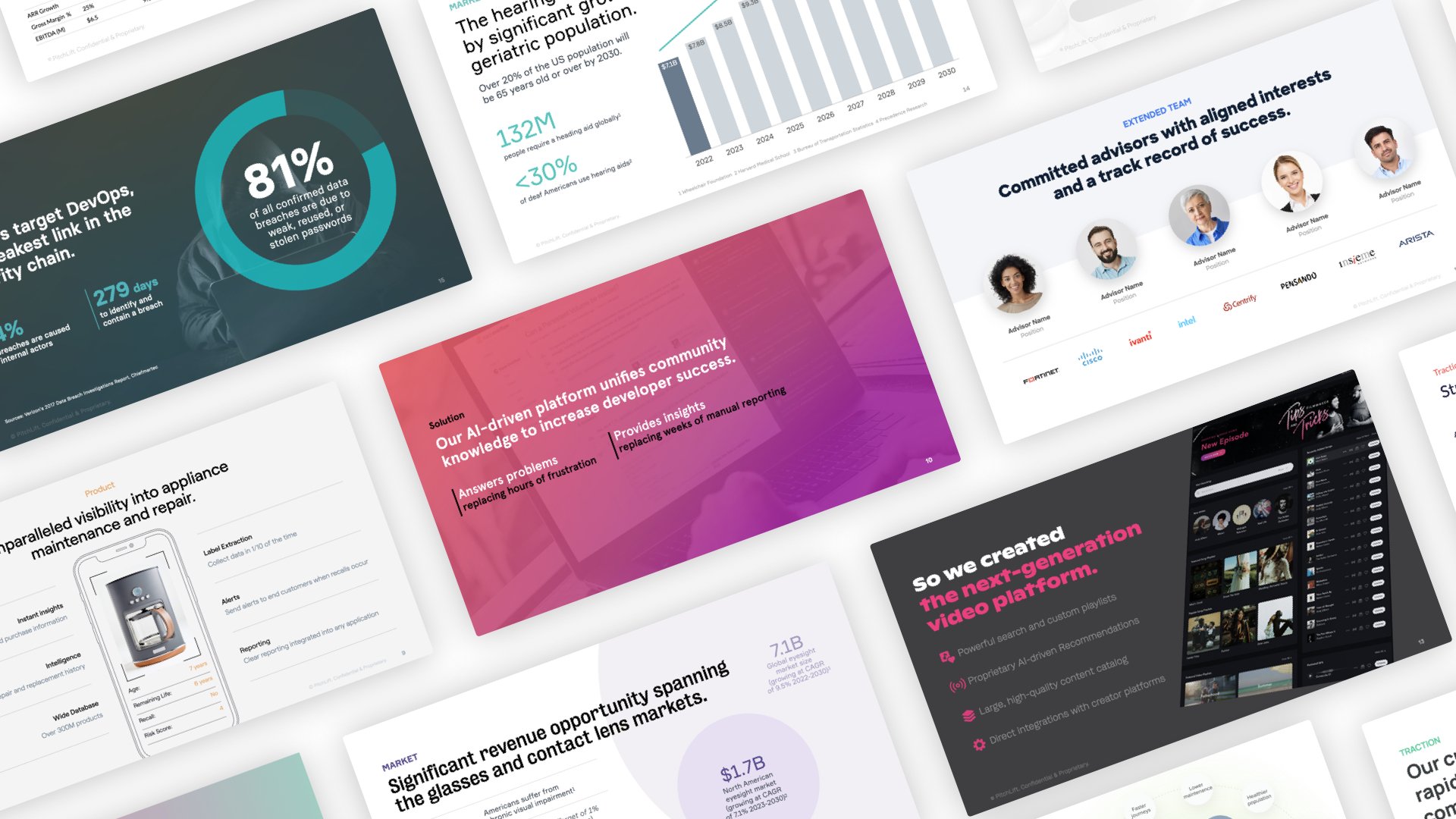 With hundreds of clients under our belt, we know how to tell your story the right way. We become temporary experts in your field, and our well-tested method allows us to understand your business, tailor an informed strategy, and create a compelling design to make your deck irresistible.